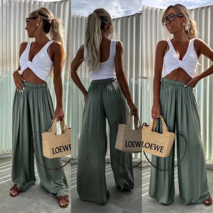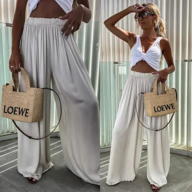 Upplev den perfekta kombinationen av stil och komfort med våra Wilma vida byxor. Den elastiska midjan ger en flexibel och bekväm passform, medan den högmidjade designen framhäver din silhuett på ett smickrande sätt. De eleganta, vida benen skapar en sofistikerad och trendig look, perfekt för alla tillfällen. Tillverkade av mjukt och andningsbart material, är dessa byxor lika bekväma som de är stilfulla. Matcha dem enkelt med dina favoritplagg för en ny, chic outfit varje dag.